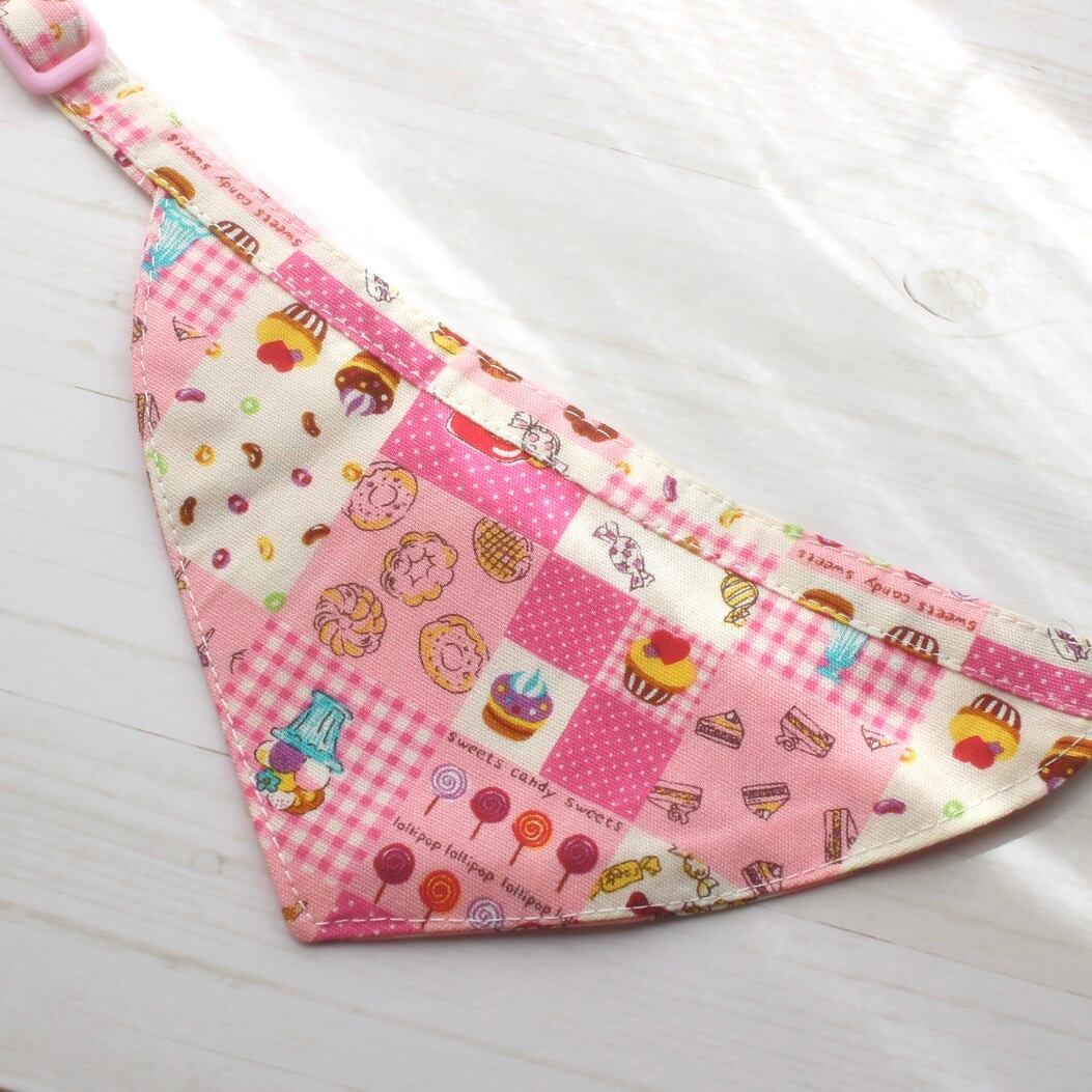 Lサイズ 可愛いピンクのお菓子柄の首輪(バンダナ部分取り外し不可)|軽量設計|大型猫 長毛種対応|小型犬可|室内用|ハンドメイド
